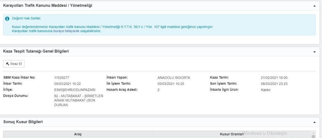 Kazaya karışan taraflar belirlenen kusur oranlarını, http://www.sbm.org.tr adresindeki “Hizmetler” Menüsü altında “Kaza Tespit Tutanağı Sorgulama ve İtiraz” adımından öğrenebilirler. Sigorta Şirketleri arasında anlaşma ile sonuçlanan kusur miktarlarına itiraz etmek isteyen taraf, 5 gün içerisinde elinde bulunan yeni bilgi ve belgeler ile sigorta şirketine başvurabilmektedir. Dolayısıyla haklılığını ispat etmek için kaza sırasında ki ayrıntılı fotoğraf ve video çekimleri çok büyük önem arzetmektedir. 5 günlük süre içinde itiraz hakkının kullanılmadığı veya itiraz hakkı kullanılmış olup talebin karşılanmadığının değerlendirildiği durumlarda, sigortalıların kusur oranına ilişkin itirazlarının Tahkim Komisyonu ve özel hukuk yollarına başvurulmak suretiyle çözülmesi gerekmektedir. Ayrıca ifade etmek gerekir ki kazaya karışan araçların sigorta şirketlerinin aynı olması halinde belirlenen kusur oranına http://www.sbm.org.tr adresindeki “Hizmetler” Menüsü altında “Kaza Tespit Tutanağı Sorgulama ve İtiraz ” bölümünde 5 iş günü içerisinde itiraz edilebilmekte ve tutanağın Kaza Kusur Değerlendirme Komisyonu tarafından değerlendirilmesi sağlanabilmektedir. Ancak kazaya karışan araçların sigorta şirketlerinin farklı olması halinde yukarıda da ifade edildiği üzere sigortalı itirazını kendi sigorta şirketine yapmaktadır. Bu takdirde SBM uygulaması üzerinden bir itiraz yapılamayacaktır.